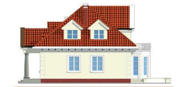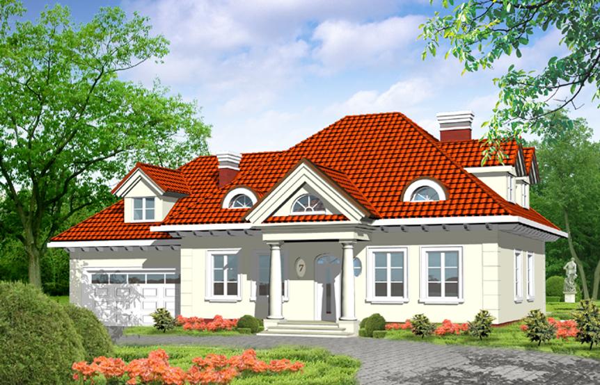 Stylowy, wolno stojący dom jednorodzinny, z użytkowym poddaszem, z przybudowanym garażem na dwa samochody, bez podpiwniczenia. Bardzo przestronny, funkcjonalny i łatwy w realizacji. Budynek został zaprojektowany w zwartej bryle, na rzucie prostokąta, z centralnie usytuowanym wejściem w postaci tradycyjnego ganka. Część prywatna została umieszczona na poddaszu, parter stanowi przestrzeń ogólnoużytkową.